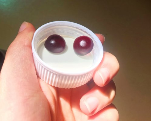 小黑果软糖的形状是个立体半圆,直径大概1cm,颜色是深蓝紫色,在阳光下呈紫色,虽然是软糖,但还是有点硬,不过比起片状药片要软很多。